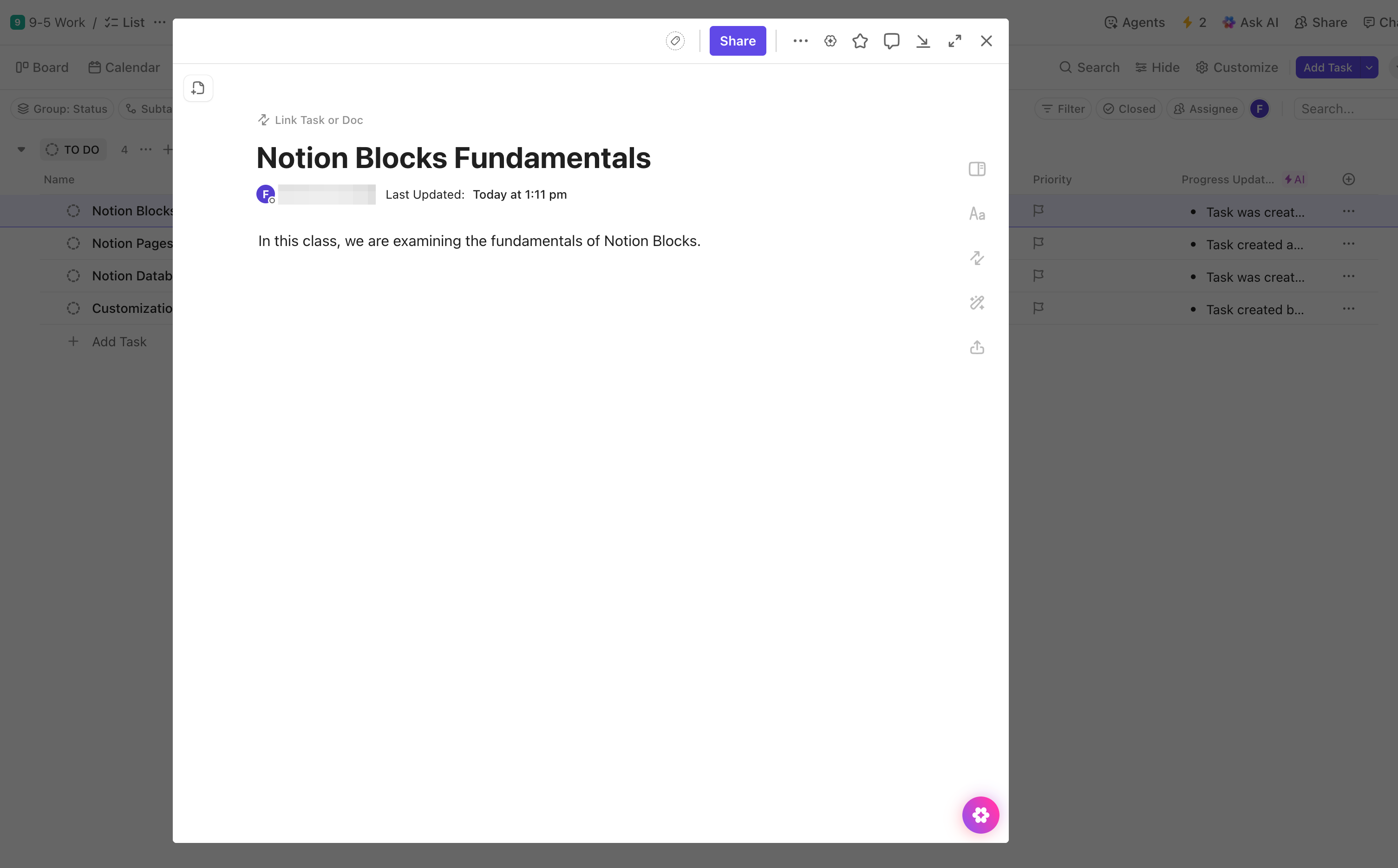 For example, click the Notion Blocks task as you learn the course.