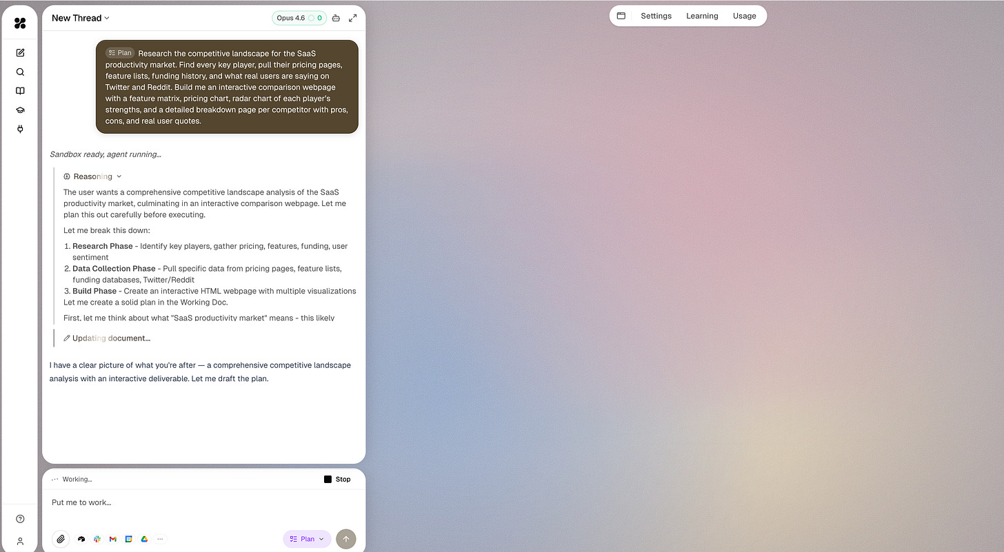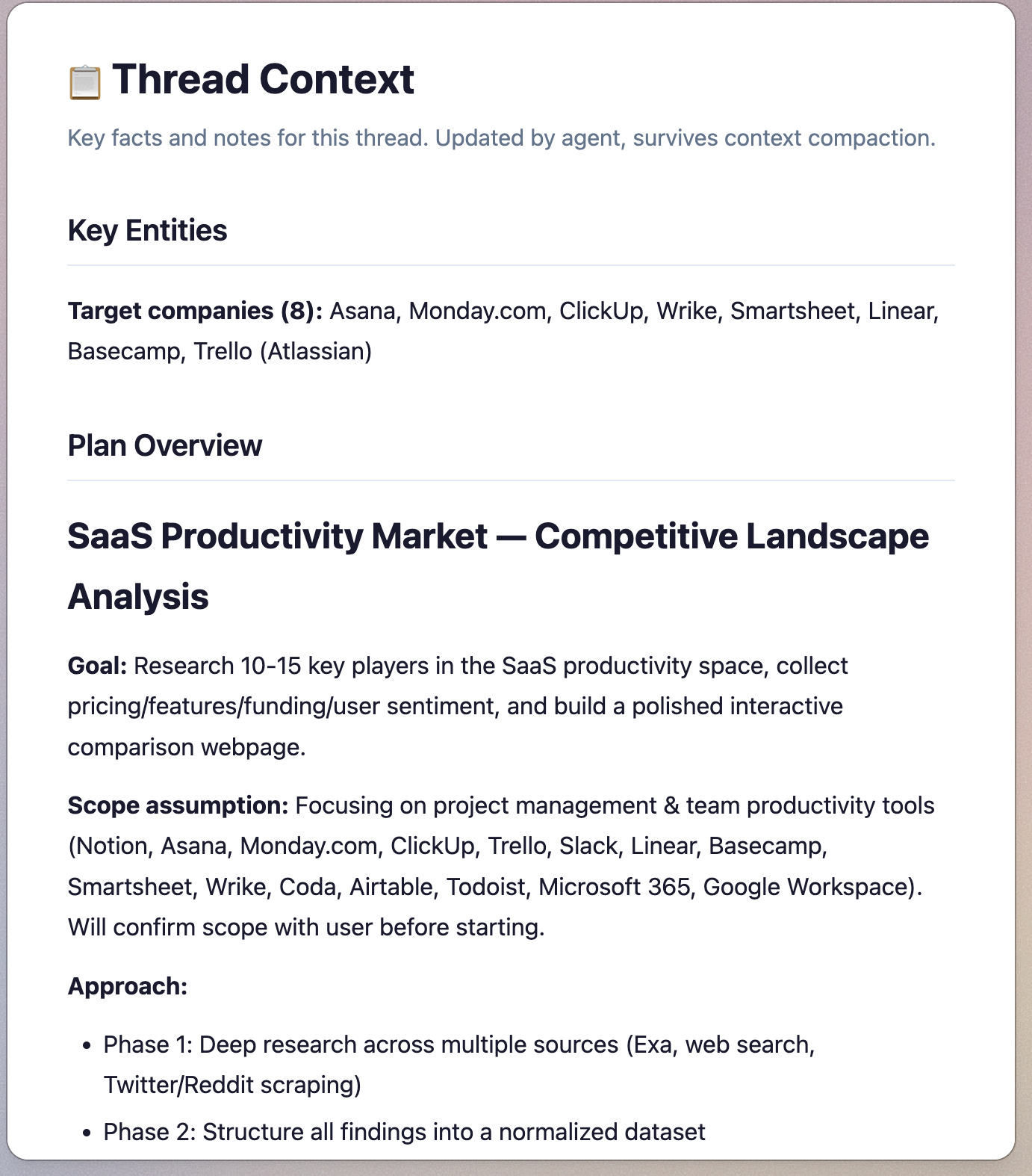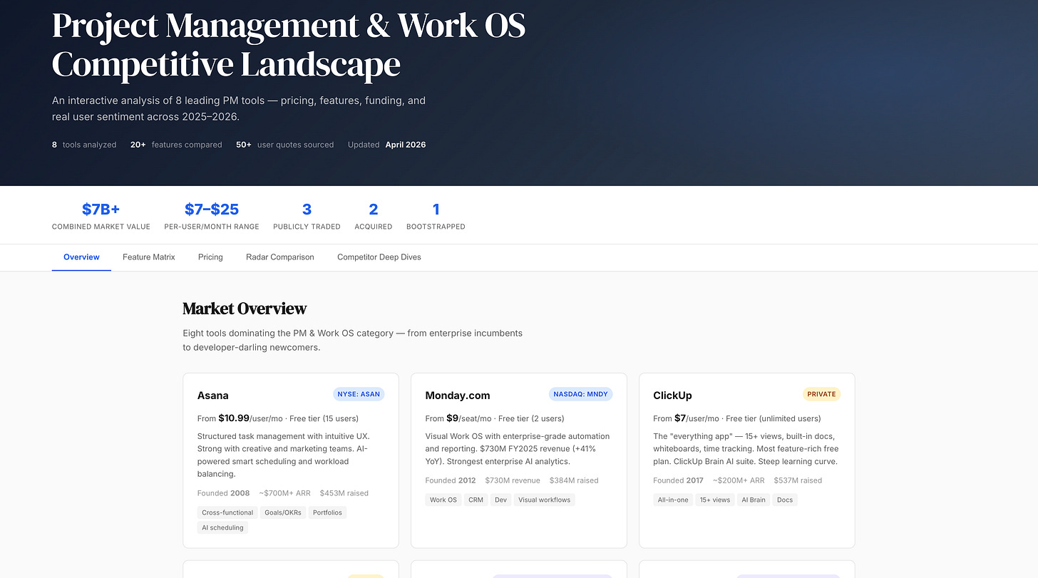 Research the competitive landscape for the SaaS productivity market. Find every key player, pull their pricing pages, feature lists, funding history, and what real users are saying on Twitter and Reddit. Build me an interactive comparison webpage with a feature matrix, pricing chart, radar chart of each player’s strengths, and a detailed breakdown page per competitor with pros, cons, and real user quotes.